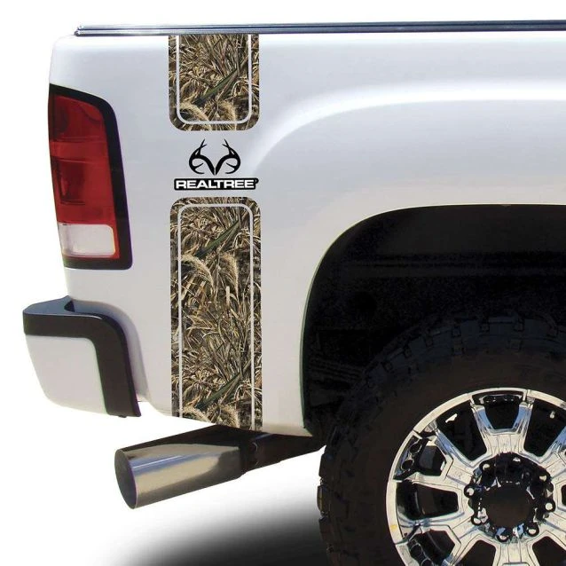 Show off your love for the outdoors on your truck with the Camowraps® Bed Band Quarter Panel Accent Kit with Realtree logo and Realtree camo. This easy-to-use kit is a convenient way to add a strip of Realtree Xtra or Realtree Max-5 camo to the rear quarter panel of your vehicle. Camo strip graphic features Realtree Antler logo. Each strip measures 10″ x 40″. Kit includes: 2 strips. Designed to fit the quarter panel of all compact and full size trucks.